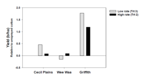 Although there were no statistically significant differences in yield between mepiquat chloride treatments across all sites there were tendencies for yield to be improved in the more southern growing regions with mepiquat chloride applied early. The relative yield (the yield difference between the control and the mepiquat treatment) was up to a bale more with applied mepiquat chloride compared to the control (see Figure 1). Little differences were recorded in Wee Waa and Cecil Plains.