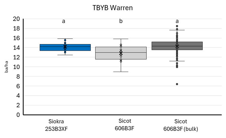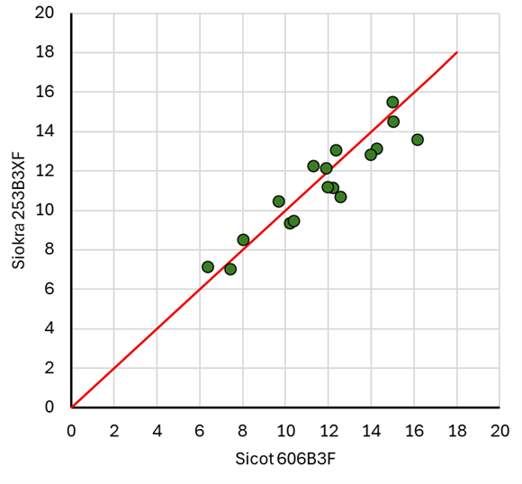 - The yield results demonstrated Siokra 253B3XF yielded better than the adjacent hectares planted of Sicot 606B3RF and just as well as the Sicot 606B3RF under the same management regime in the remainder of the field [see Figure 1].