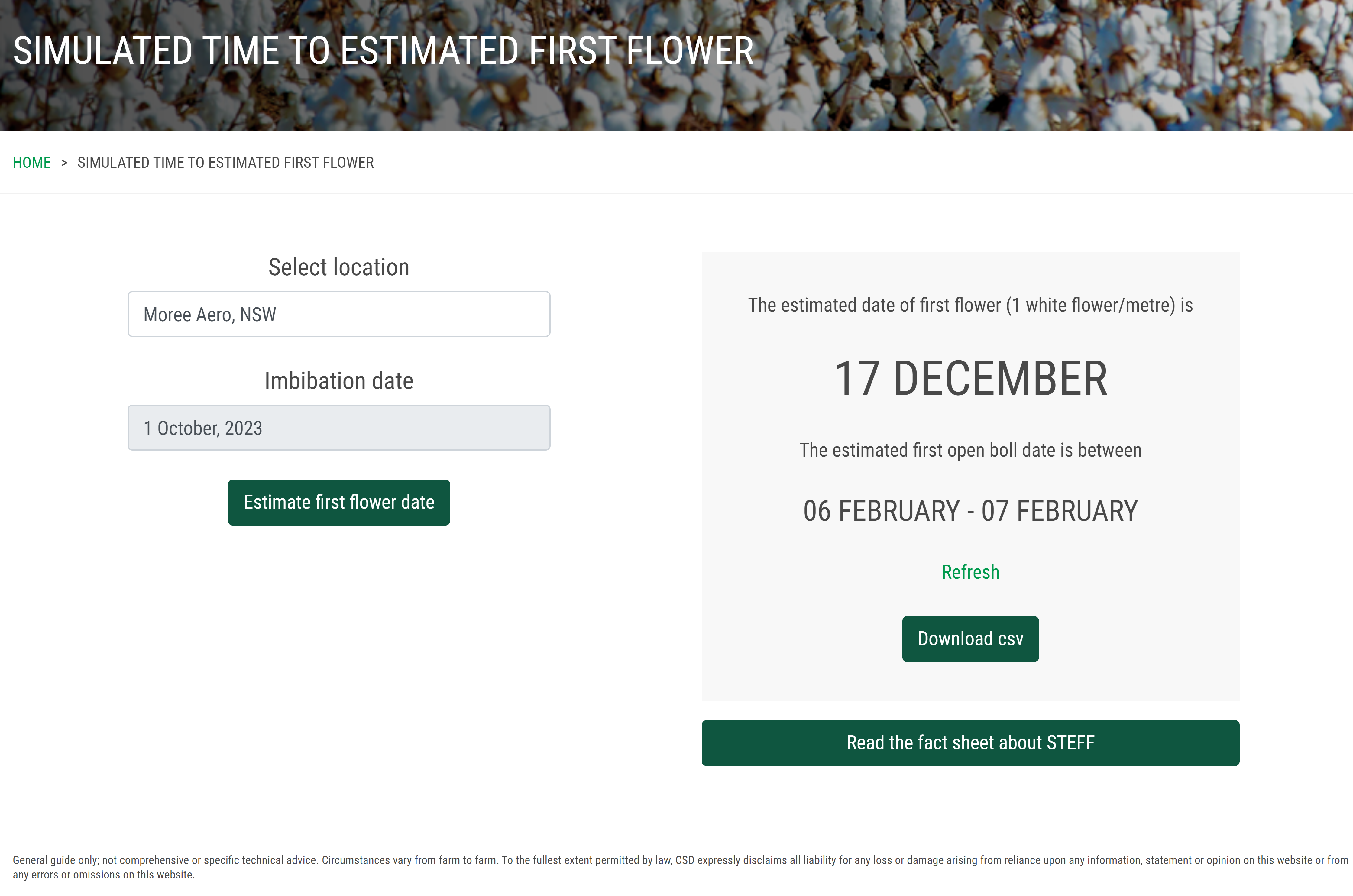 The details: The aim of the model is to assist with defining the time of first flower. This should complement field observations with the aim to assist with management decisions and scheduling of operations leading up to first flower. CSD envisage that STEFF will be used to assist growers to complement the decision making process leading up to first flower and importantly, the first irrigation. First irrigation timing is critical to ensure the crop is set up to generate strong growth during the flowering period, when most yield potential is determined. Click here for more information on timing of first irrigation. STEFF can be queried at any time via any device with an internet connection. It is simple to operate, only requiring the user to select the nearest location and the date of seed imbibition – often this is the day of planting if the seed was planted into moisture, or the day of watering up. The tool will then return an estimated date of first flower.